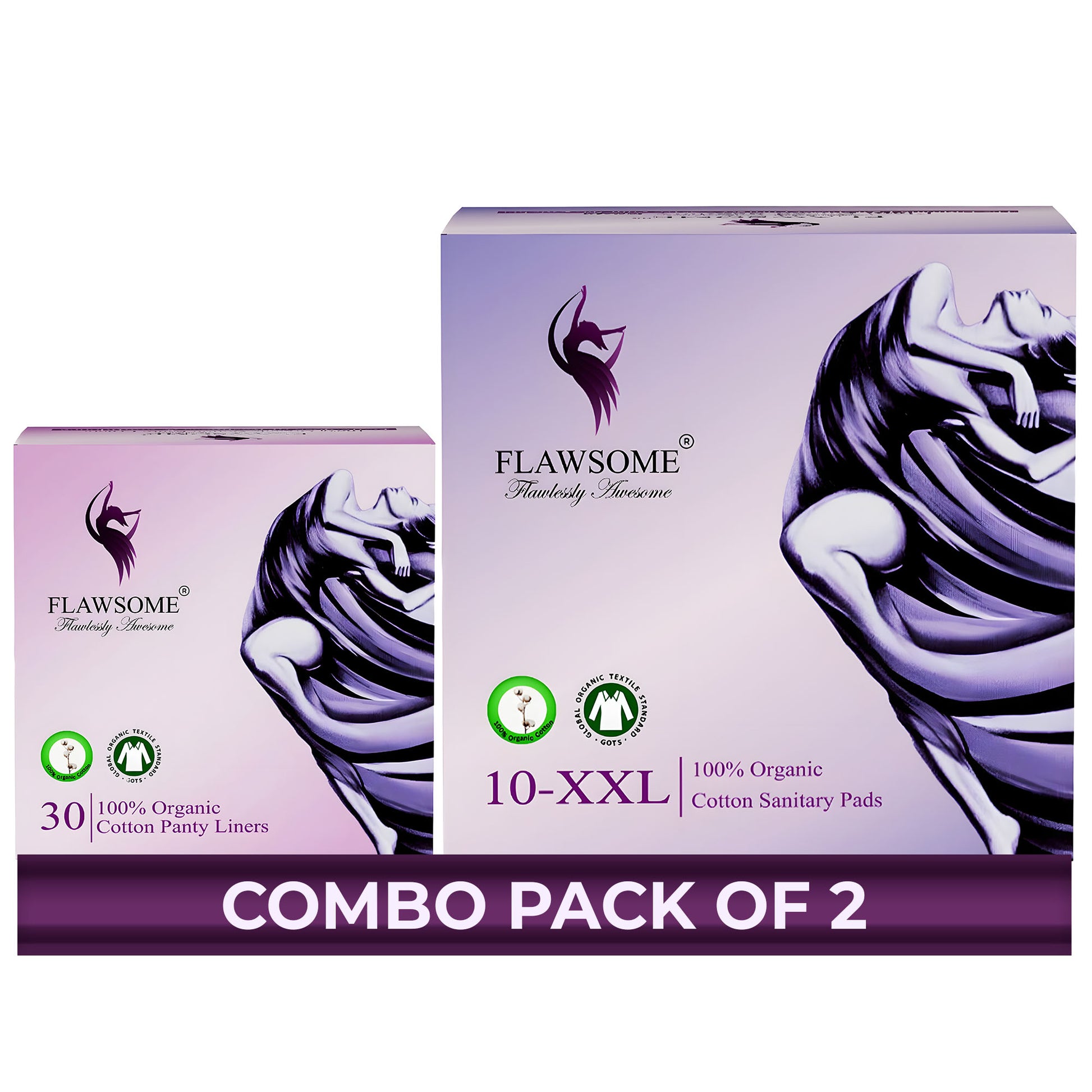 Flawsome 100% Organic Sanitary Pads | High Absorption | Cotton Sanitary Pads | Soft and Rash Free | Toxin-Free (Liner -30 Pads-10, XXL)