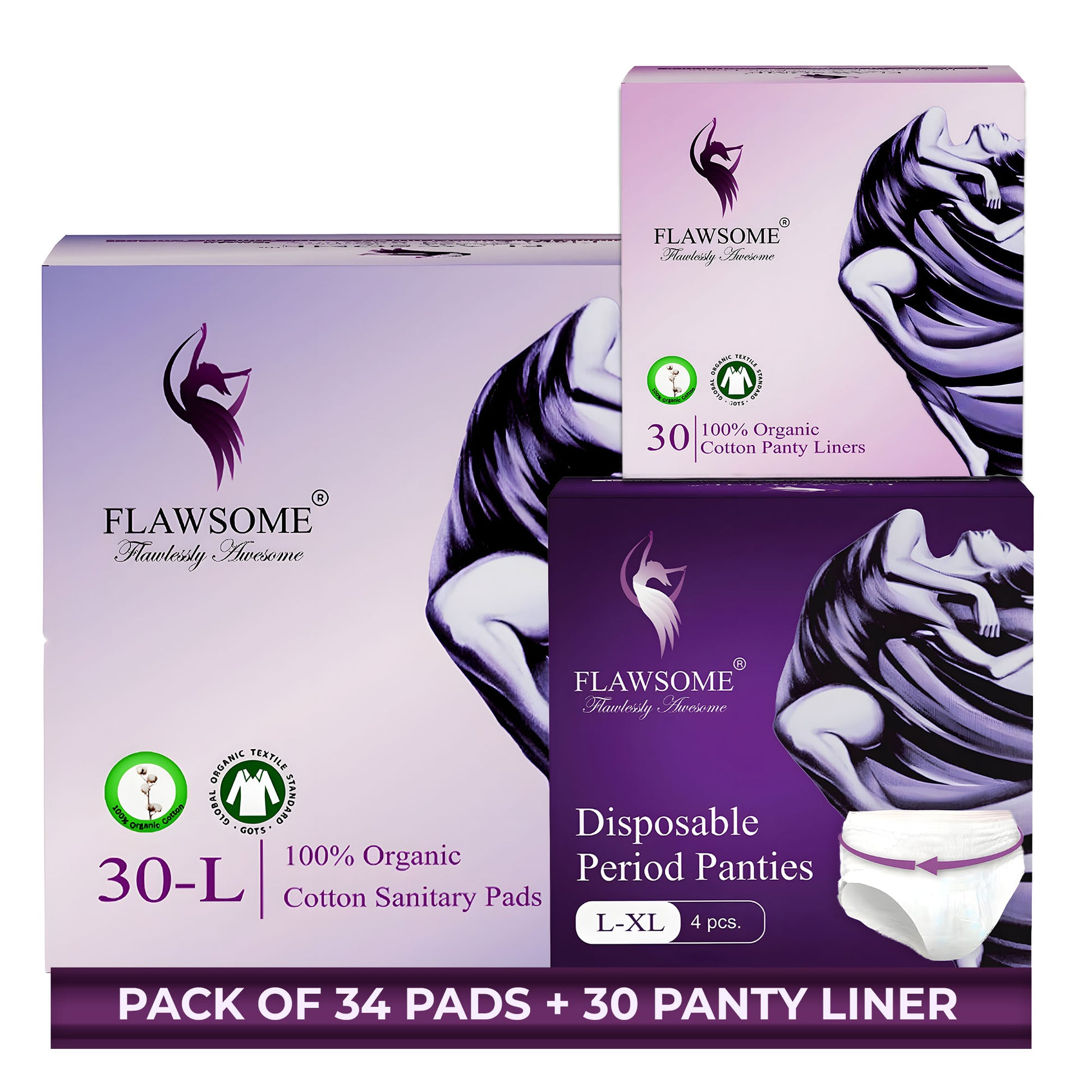 Flawsome Period Combo for Women | L Cotton Sanitary Pads (Pack of 30) + Cotton Panty Liners (Pack of 30) + Disposable Period Panties Size L (Pack of 4) | Ultra-Thin, Rash-Free, Toxin-Free, Leak-Proof | With Disposal Cover | For Sensitive Skin